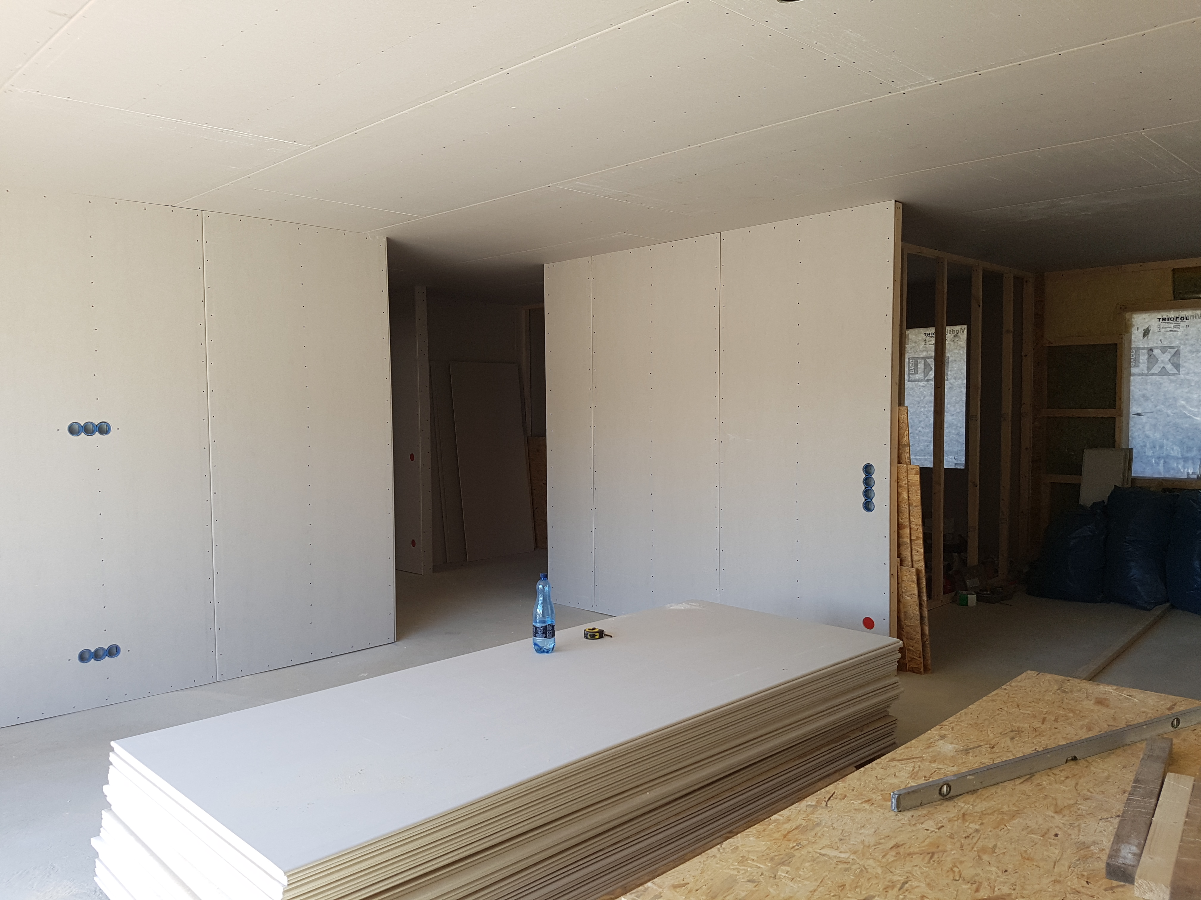 Mums ir viena liela telpa, šinī stadijā muļķīgi būtu to sadalīt ar starpsienām atsevišķās telpās, kā to daudzi dara, un tad taisīt apdari daudzām plaknēm, ja var strādāt ar dažām, tādējādi ievērojami ieekonomējot laiku un darbu- griesti mums jāliek vienā telpā, nevis deviņās, izkraujam reģipsi un sākam. Darbu ļoti ievērojami paātrina arī automātiskā skrūvju pistole ar skrūvēm lentās, kaut arī tā bieži niķojas.